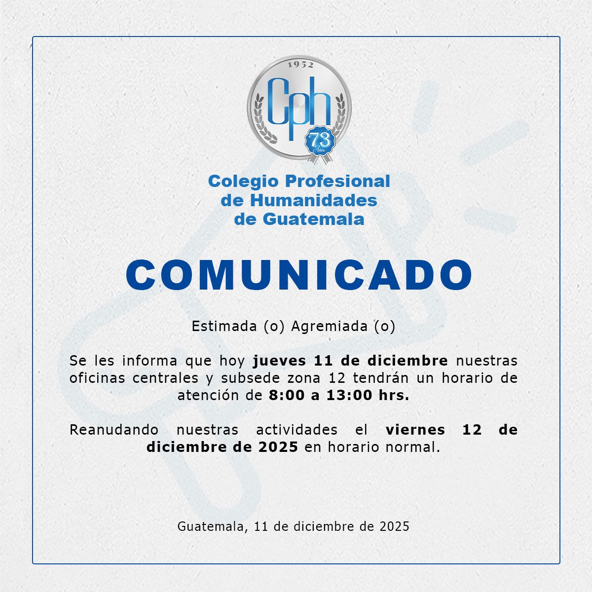 El Colegio Profesional de Humanidades de Guatemala informa a todos los agremiados que este jueves 11 de diciembre nuestras oficinas centrales y la subsede de zona 12 tendrán un horario de atención de 8:00 a 13:00 horas.
