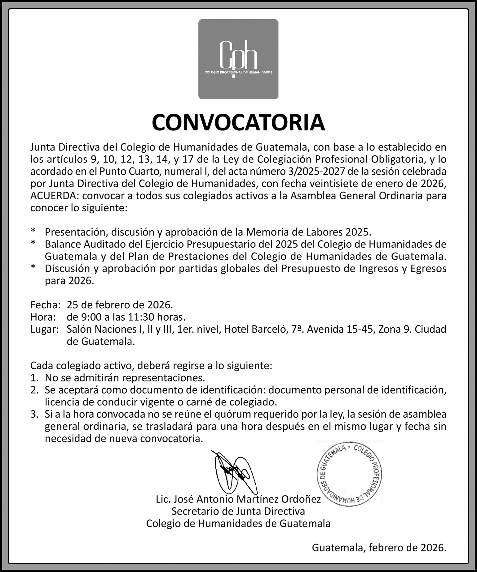 La Junta Directiva del Colegio Profesional de Humanidades de Guatemala, con fundamento en la Ley de Colegiación Profesional Obligatoria y lo acordado en sesión celebrada el 27 de enero de 2026, convoca a todos sus colegiados activos a participar en la Asamblea General Ordinaria, en la cual se conocerán los siguientes puntos: