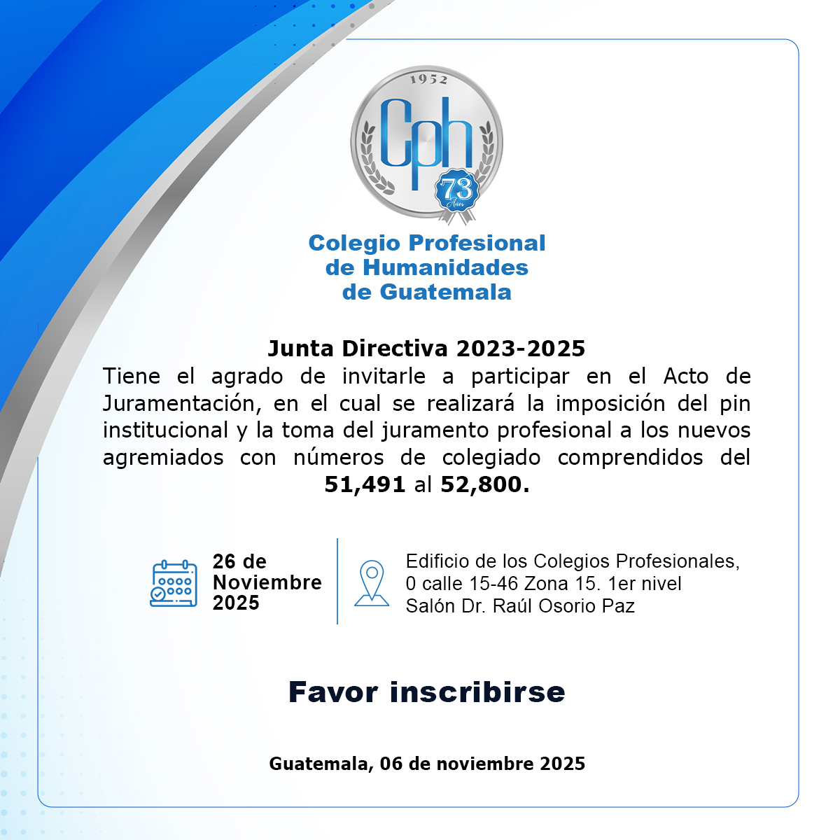 El Colegio Profesional de Humanidades de Guatemala, por medio de la Junta Directiva 2023-2025, tiene el agrado de invitar a los nuevos agremiados con números de colegiado comprendidos del 51,491 al 52,800 a participar en el Acto de Juramentación.